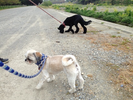 川の脇の道をゆっくり散歩。こはるがすぐに拾い食いをするから、口元をいつも気にしてますが、耳がでかいから口元が見えない!!