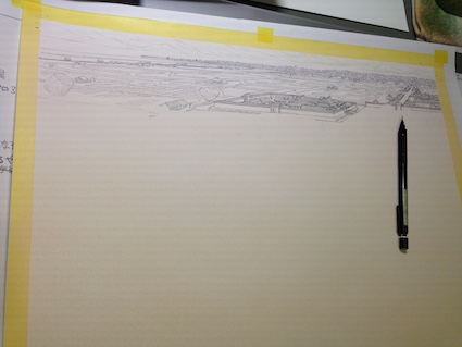 元太郎の線画はシャーペンですが、遠景は3Hで描き、近景になるとHも使って遠近のメリハリをつけます。