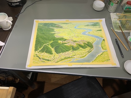 あとは川の色を濃くして、中心の城を描いて、全体に色を追加して、人の点々を入れて影を入れて、と、やる事はまだまだありそうです。