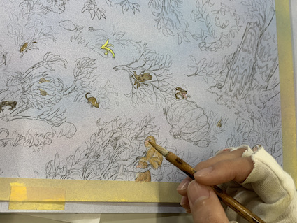 しおり、迷路絵本、見開き6枚目の生き物の色塗りの終盤です。