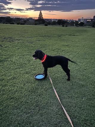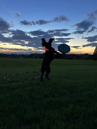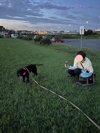 こはるは、暗い中フリスビーをしてストレス発散です。