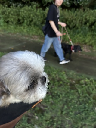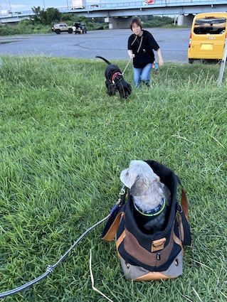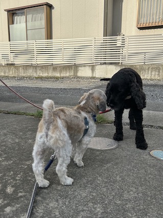 こはるは山方面、知り合いに撫でてもらったりしてゆっくり帰ってきたら、ファービーが家の前で待ってました。